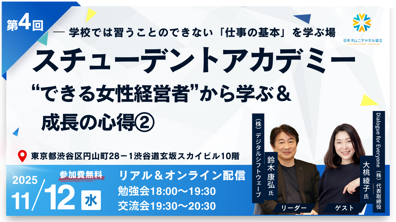 第4回 | 11月12日(水) | “できる女性経営者”から学ぶ&成長の心得② | 講和:Dialogue for Everyone大桃 綾子氏の生き様 講義:本気でやり抜く/失敗から学ぶ/今を生きる |